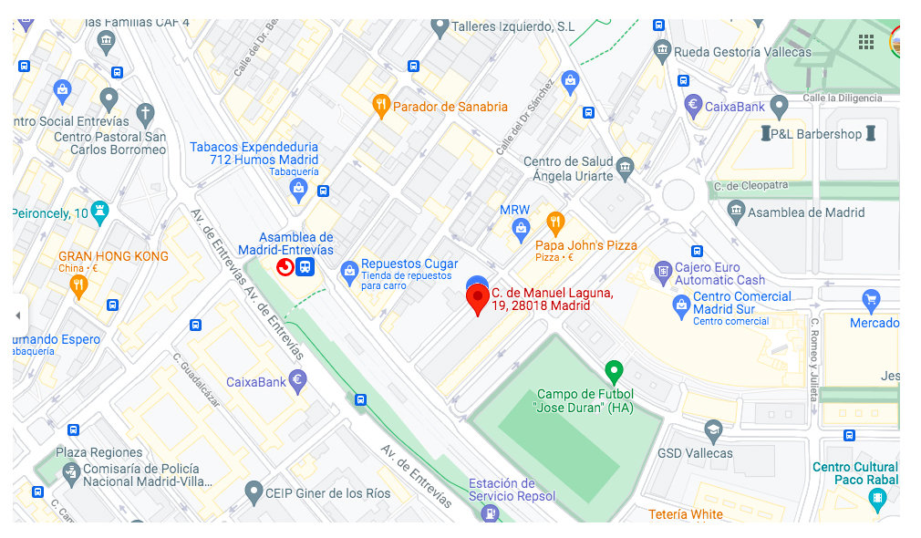 You can reach us by Cercanías at Entrevías - Asamblea de Madrid station (One after Atocha).